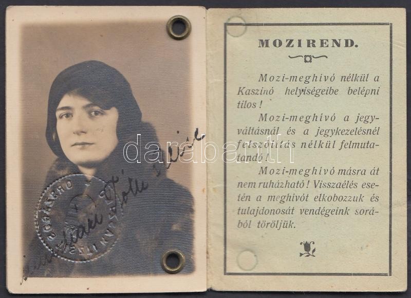 1943 Országos Tisztikaszinói Mozi-meghívó, fényképes igazolvány https://www.darabanth.com/de/206-Fernauktion/206.0/Andere-Sammelgebiete/Dokument~10018/1943-Orszagos-Tisztikaszinoi-Mozi-meghivo-fenykepes-igazolvany~II831918