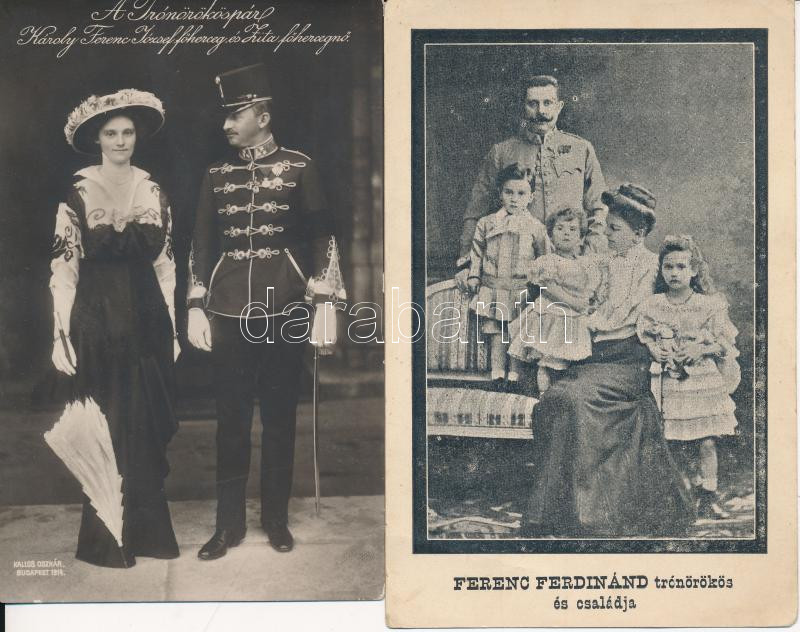 Beschreibung: cca 1913-1916 Trónörökösök: Ferenc Ferdinánd és családja (nyomdai képeslap), IV. Károly és Zita főhercegnő (fotólap), Kallós Oszkár felvétele, 14x9 cm