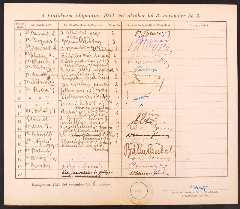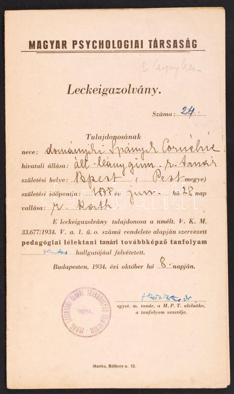 1934 Bp., Magyar Psychologiai Társaság Leckeigazolványa