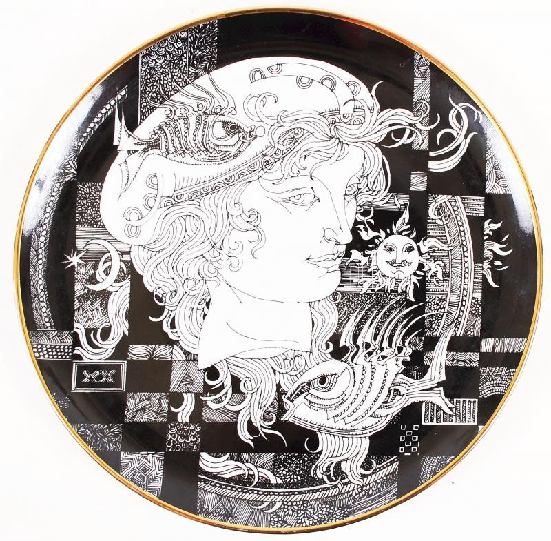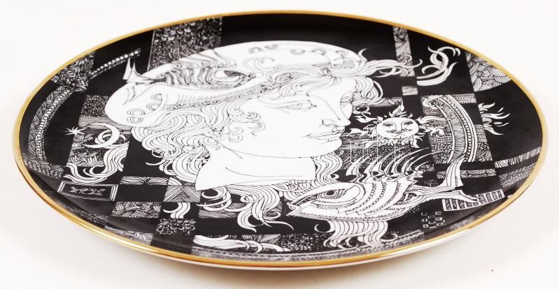 Hollóházi Szász Endre tervezte falitányér, matricás, jelzett, hibátlan... https://www.darabanth.com/de/206-Fernauktion/206.0/Andere-Sammelgebiete/Porzellan~10041/Hollohazi-Szasz-Endre-tervezte-falitanyer-matricas-jelzett-hibatlan-d24-cm~II831507