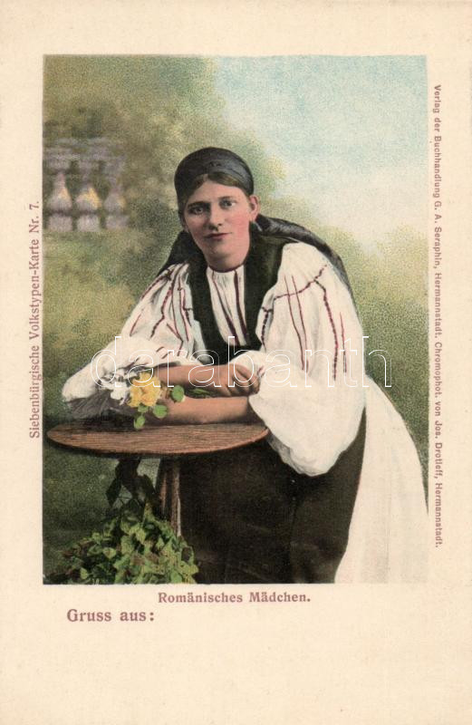 Beschreibung: Romänisches Mädchen, Siebenbürgische Volkstypen-Karte Nr. 7. / Romanian folklore