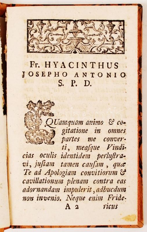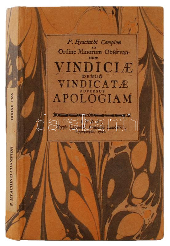 P. Hyacinthi Campion: ordine Minorum Observantium Vindicae denuo Vindicatae adversus Apologiam Josephi Antonii Transílvani, e Clero Saeculari Diaecelis Vaciensis Presbyteri, quibus Sectam Fratricellorum e Sodalitio Minorum neutiquam prodiisse rursus defendítur. Buda, 1766, Leopold Landerer. Újrakötött kartonált kötés, színezett lapszélek, jó állapotban.