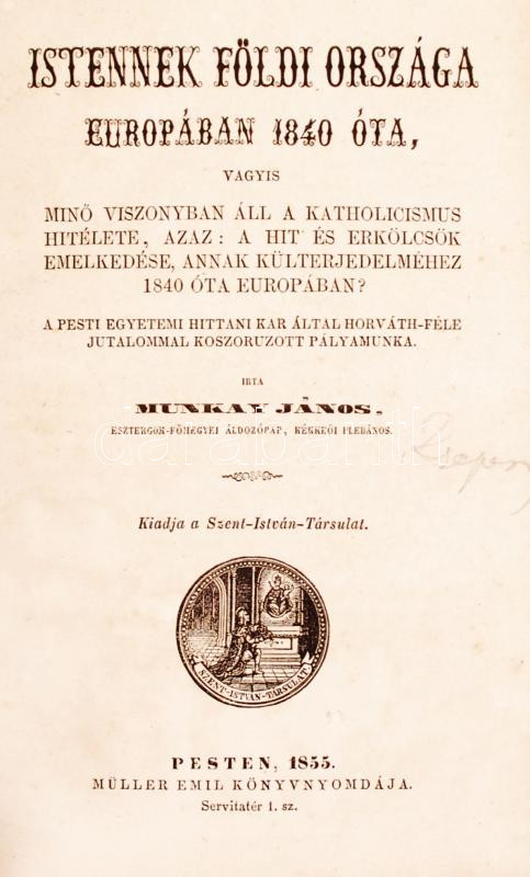 Munkay János: Istennek földi országa Európában 1840 óta, vagyis minő viszonyban áll a katholicismus hitélete, azaz: a hit és erkölcsök emelkedése, annak külterjedelméhez 1840 óta Európában?