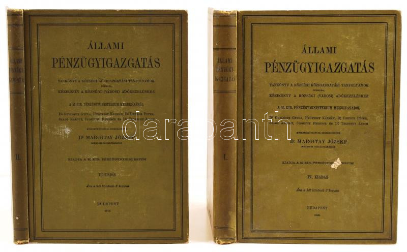 Dr. Margitay József (szerk.): Állami Pénzügyigazgatás. Tankönyv a községi közigazgatási tanfolyamok számára, kézikönyv a községi (városi) adókezeléshez. I-II. kötet, Bp., 1905-1908. enyhén kopott vászon kötésben.