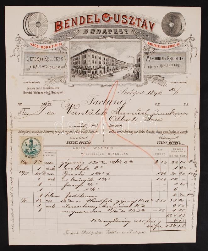 1892 Bp. V., Bendel Gusztáv malomipari szaküzlet számla https://www.darabanth.com/de/207-Fernauktion/207.0/Andere-Sammelgebiete/Dokument~600015/1892-Bp-V-Bendel-Gusztav-malomipari-szakuzlet-szamla~II830309