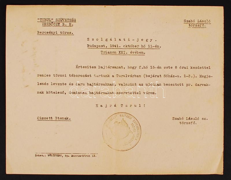 1941 "Turul" Szövetség szolgálati-jegy https://www.darabanth.com/de/207-Fernauktion/207.0/Andere-Sammelgebiete/Dokument~600015/1941-Turul-Szovetseg-szolgalati-jegy~II843215