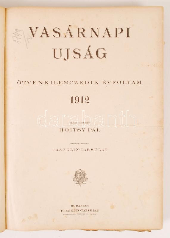 1912 Vasárnapi Ujság. Szerk. Hoitsy Pál, 1. fél évfolyama, bekötve. Fe... https://www.darabanth.com/de/207-Fernauktion/207.0/Andere-Sammelgebiete/Drucksachen~600026/1912-Vasarnapi-Ujsag-Szerk-Hoitsy-Pal-1-fel-evfolyama-bekotve-Festett-jo-allapotu-eg~II835974