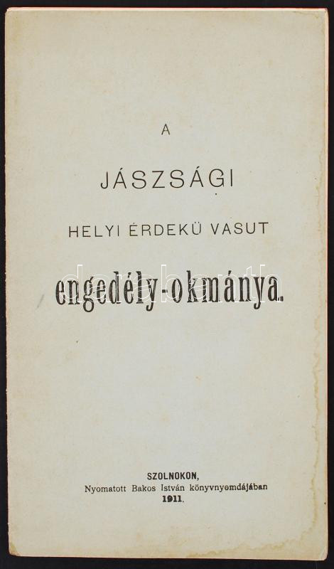 A jászsági helyi érdekű vasút engedély-okmánya. Szolnok, 1911. Bakos I... https://www.darabanth.com/de/207-Fernauktion/207.0/Andere-Sammelgebiete/Drucksachen~600026/A-jaszsagi-helyi-erdeku-vasut-engedely-okmanya-Szolnok-1911-Bakos-I-26p~II825139