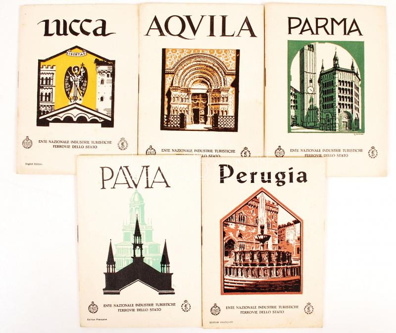 Beschreibung: cca 1930-1940 5 db Olaszországgal foglalkozó utazási prospektus angol és francia nyelven (Perugia, Pavia, Parma, Aquila, Lucca) /