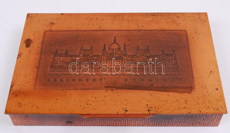 Beschreibung: A magyar Parlament látképével díszített réz dobozka belső fa burkolattal, 16x10x2 cm
