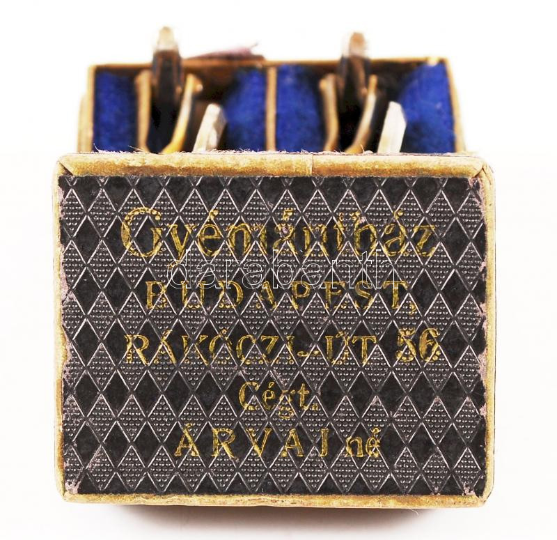 Beschreibung: Antik mandzsetta pár, kő hiányzik belőle, eredeti dobozában, 3×4 cm
