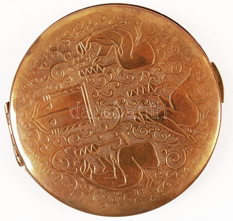 Réz púdertartó, belsejében kis tükörrel, d: 8 cm. https://www.darabanth.com/de/207-Fernauktion/207.0/Andere-Sammelgebiete/Flohmarkt~600011/Rez-pudertarto-belsejeben-kis-tukorrel-d-8-cm~II842960