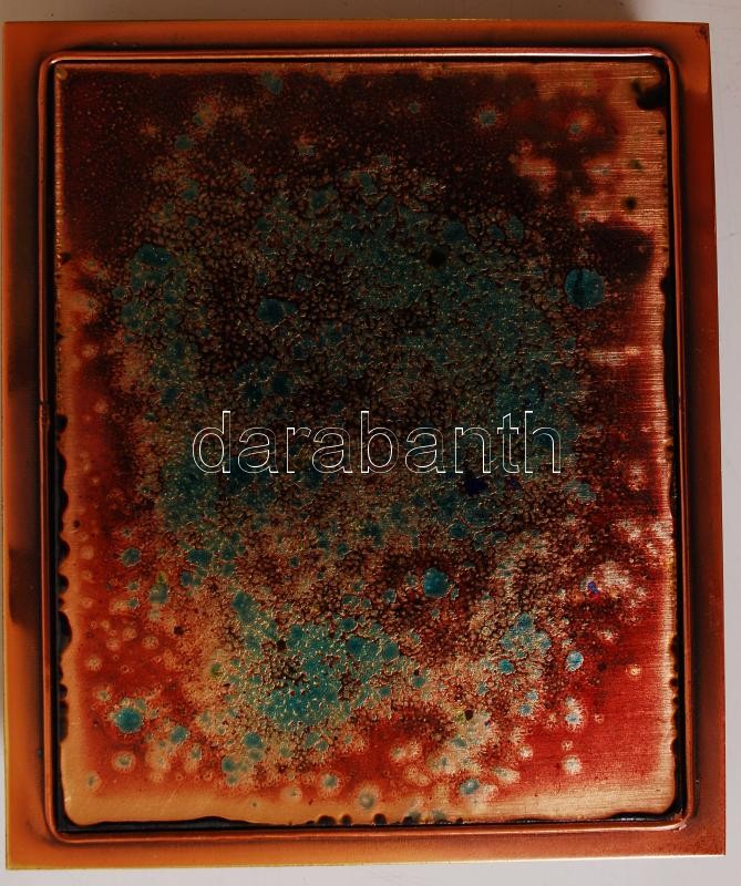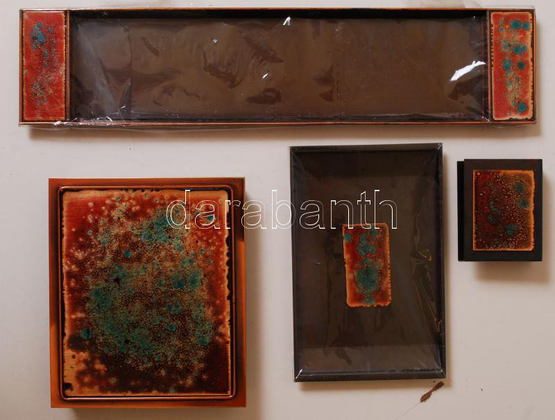 Beschreibung: Réz tétel (4 db): Üvegzománccal díszített asztali hamutartó, dísztálka, szalvétatartó és dobozka