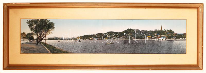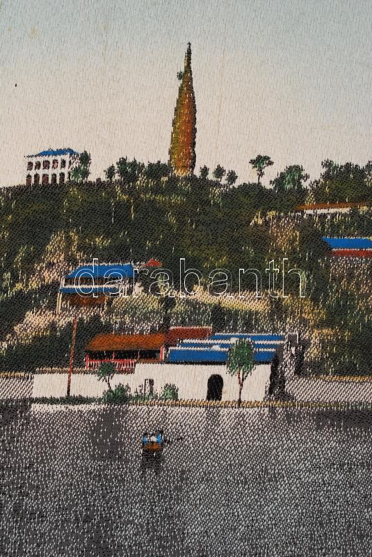 Beschreibung: Távol kelti panorámás gobelin kép, apró hibákkal, nagyméretű, sérült keretben, 26×120 cm