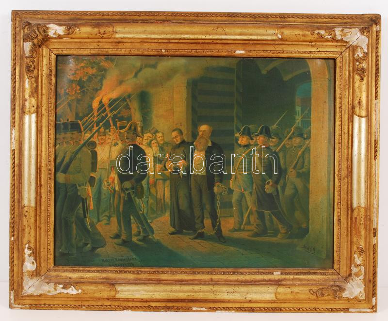 Beschreibung: cca 1880 Batthyány Lajost a vesztőhelyre kísérik. Méhner Vilmos olajnyomata Jankó János (1833-1896) festménye nyomán, antik hibás keretben 40×50 cm