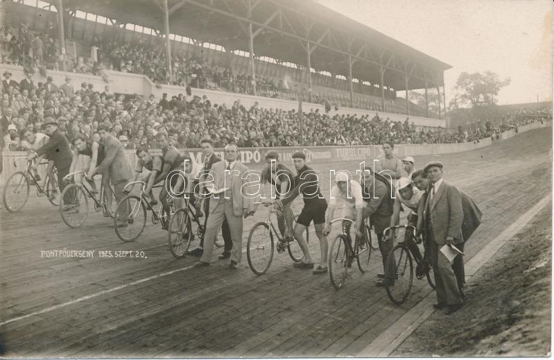 Beschreibung: 1925. szept. 20. Varga I.: Kerékpáros pont-főverseny a budapesti Millenáris Velodrom-ban, fotóképeslap, pecséttel jelzett, 9x14 cm