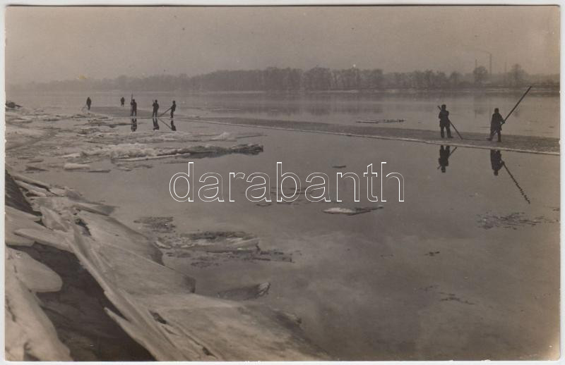 Beschreibung: 1934 január Budapest, Újpest, téli kikötő, a hajók közül kivágott jégtáblákat kitolják a sodrásba, 9x14 cm