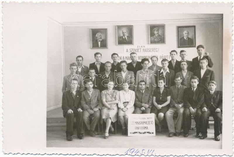 1945. június Az MKP (Magyar Kommunista Párt) Egerben tartott szeminárium vezetői tanfolyamának résztvevői, a háttérben jelmondatok és eszmei példaképek, 8x13 cm