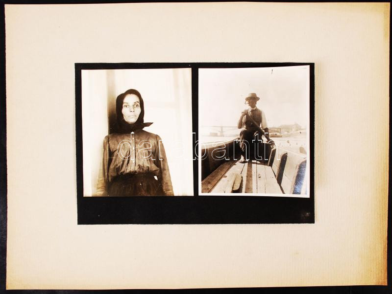 Beschreibung: cca 1900-1910 Tiszai halász és a felesége, a háttérben a szegedi híd, 2 db fotó, albumlapra felragasztva, fotóméret 9x8 cm, karton 21x28 cm