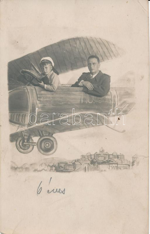 Beschreibung: cca 1910-1920 Helfgott Sámuel (Városliget): Repülőgéppel Budapest felett, műtermi illúzió, 8x13 cm