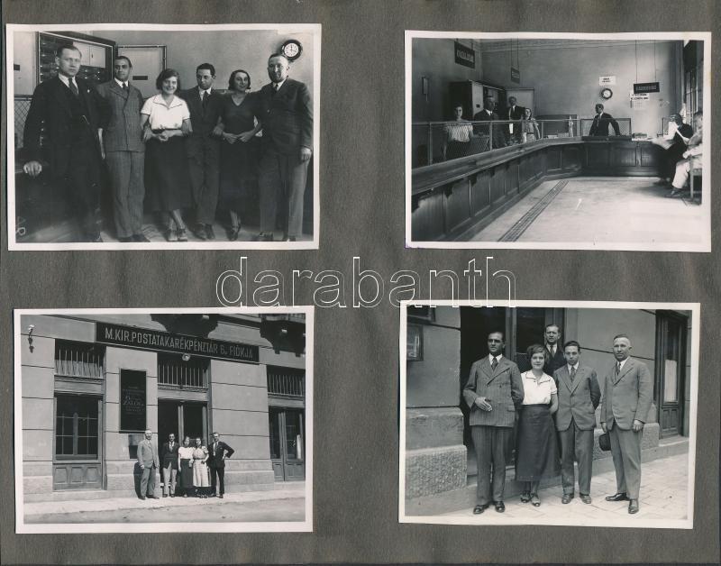 Beschreibung: cca 1920-1930 Bp., M. Kir. Postatakarékpénztár 6. sz. zálogfiókjának személyzete, portálja, belső berendezése, 4 db fotó, 6x9 cm