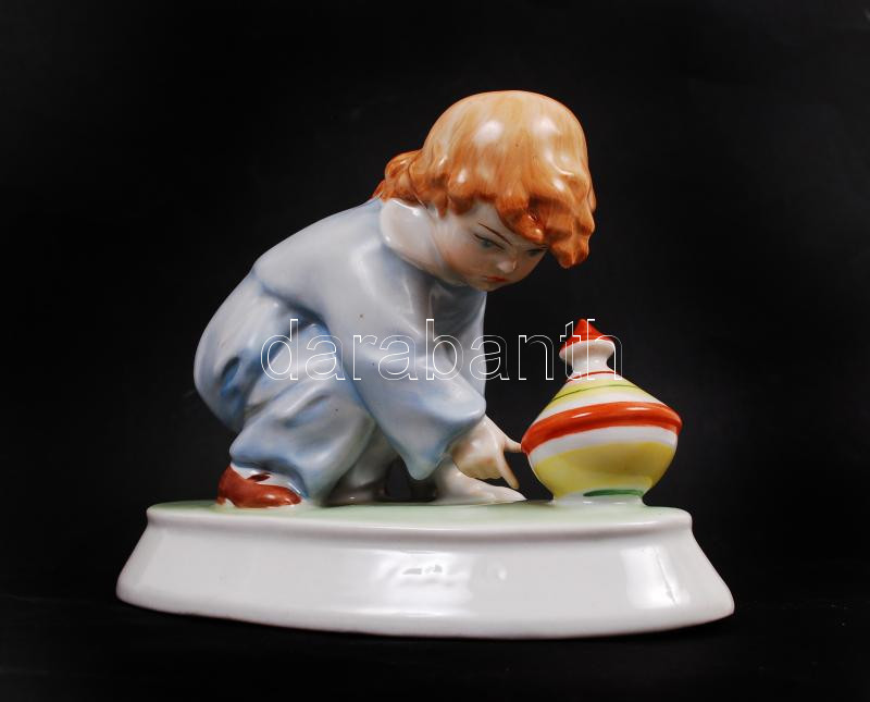 Búgócsigával játszó gyermeket ábrázoló kézzel festett jelzett Zsolnay porcelán figura hibátlan állapotban "Sinkó" jelzéssel/