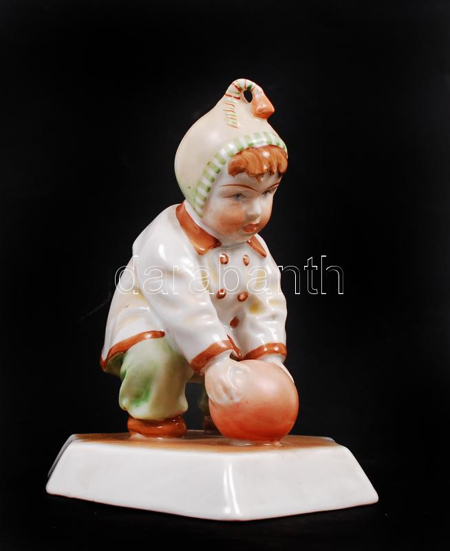 Labdával játszó gyermeket ábrázoló kézzel festett jelzett Zsolnay porcelán figura hibátlan állapotban "Sinkó" jelzéssel/