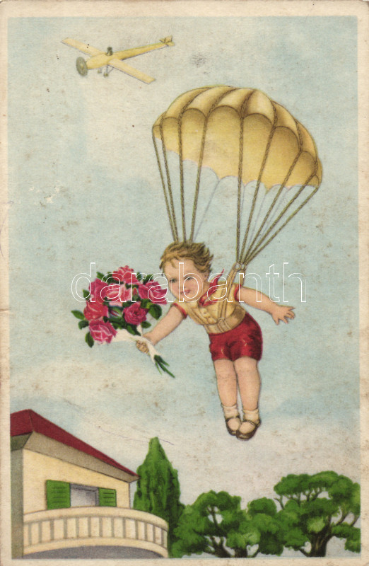 Greeting card, aeroplane, parachute https://www.darabanth.com/de/207-Fernauktion/207.0/Ansichtskarten/Flugwesen~600078/Greeting-card-aeroplane-parachute~II577223