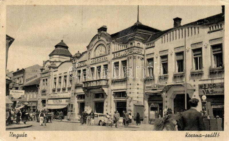 Ungvár, Korona szálló, Borbély és fodrász, Major István vas kereskedő ... https://www.darabanth.com/de/207-Fernauktion/207.0/Ansichtskarten/Karpatenukraine~8/Ungvar-Korona-szallo-Borbely-es-fodrasz-Major-Istvan-vas-kereskedo-uzlete-Barber-hair~II841988