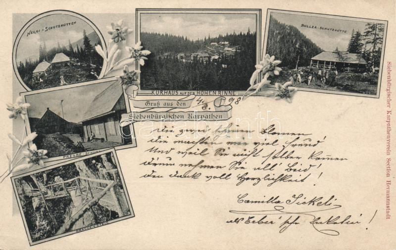 Beschreibung: 1899 Kárpátok, Siebenbürgische Karpathen; Hohe Rinne, Negoi, Bullea Schutzhütte, Presbe-Schutz, Drachensteig; floral (Rb)