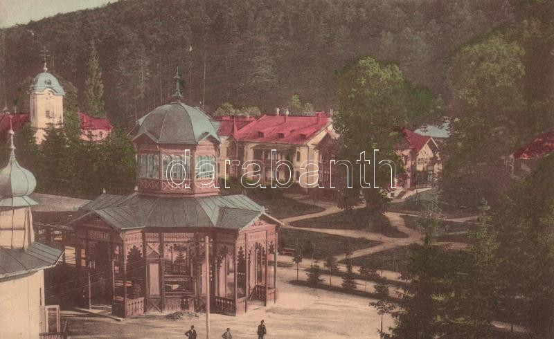 Beschreibung: Bártfafürdő, Főforrás, Római katolikus templom, villák / fountain, Roman catholic church, villas