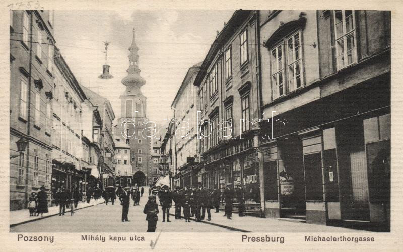 Beschreibung: Pozsony, Pressburg, Bratislava; Mihály kapu utca, templom, kakaó bolt / street, church, cocoa shop (fl)