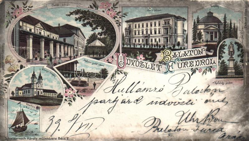 Beschreibung: 1899 Balatonfüred, Clotild udvar, vitorlás, Tihanyi templom, Ipoly udvar, templom, Kisfaludy szobor, floral, litho (kis lyuk / pinhole)