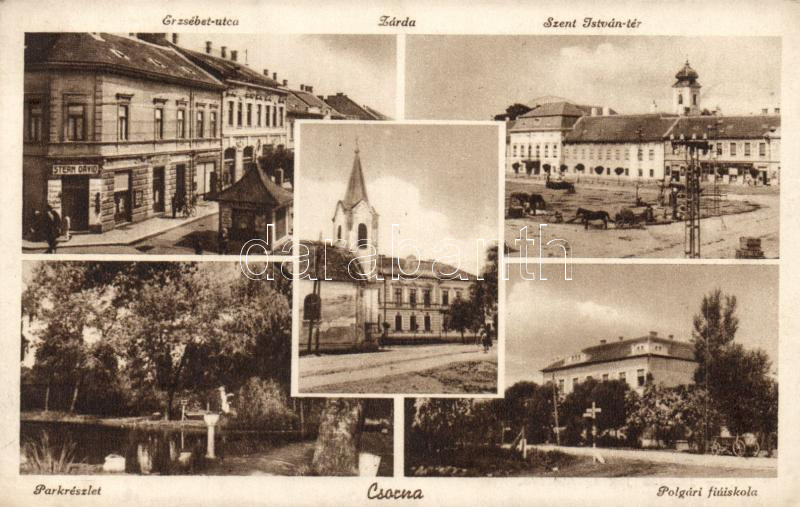 Beschreibung: Csorna Erzsébet utca Stern Dávid üzletével, Szent István tér, zárda, polgári fiúiskola (Rb)