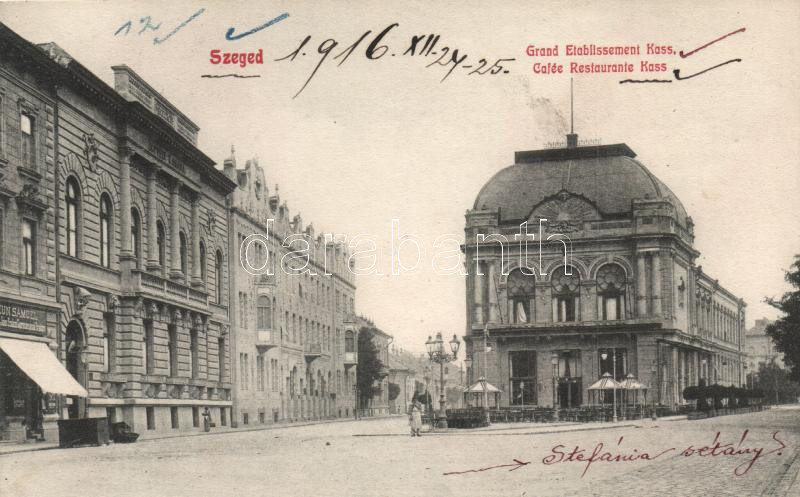 Szeged, Stefánia sétány, Kass kávézó étterem https://www.darabanth.com/de/207-Fernauktion/207.0/Ansichtskarten/Ungarn~5/Szeged-Stefania-setany-Kass-kavezo-etterem~II838717