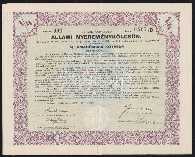 1939. Állami nyereménykölcsön államadóssági kötvénye 50P-ről https://www.darabanth.com/de/207-Fernauktion/207.0/Numismatik/Aktien-und-Tickets~200007/1939-Allami-nyeremenykolcson-allamadossagi-kotvenye-50P-rol~II385320