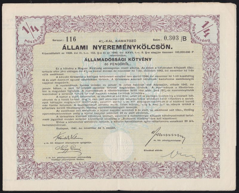 1939. Állami nyereménykölcsön államadóssági kötvénye 50P-ről https://www.darabanth.com/de/207-Fernauktion/207.0/Numismatik/Aktien-und-Tickets~200007/1939-Allami-nyeremenykolcson-allamadossagi-kotvenye-50P-rol~II385323