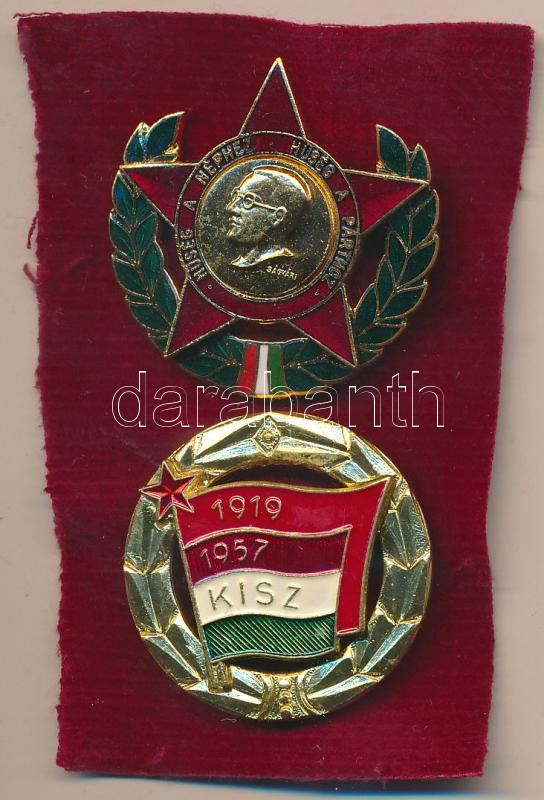 ~1960. "Hűség a néphez, hűség a párthoz" zománcozott kitüntetés. Szign.: Ságvári + 1957. KISZ zománcozott jelvény plasztik tokban T:1