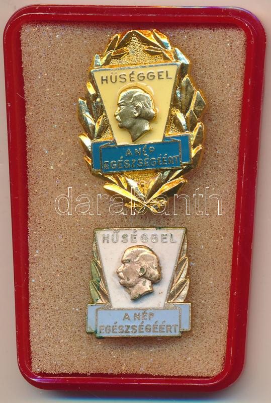 DN "Hűséggel a nép egészségéért" arany és bronz fokozat, zománcozott kitüntetések plasztik tokban T:1,2