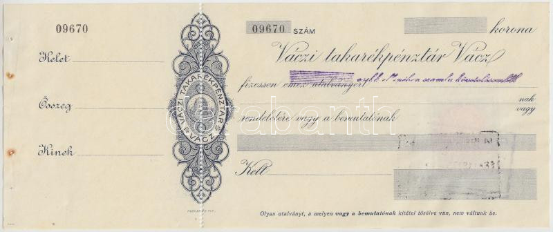 1917. "Váczi Takarékpénztár Vácz" kitöltetlen csekkje hátold... https://www.darabanth.com/de/207-Fernauktion/207.0/Numismatik/Notgelden~200008/1917-Vaczi-Takarekpenztar-Vacz-kitoltetlen-csekkje-hatoldalan-okmanybelyeg-belyegzes~II844276