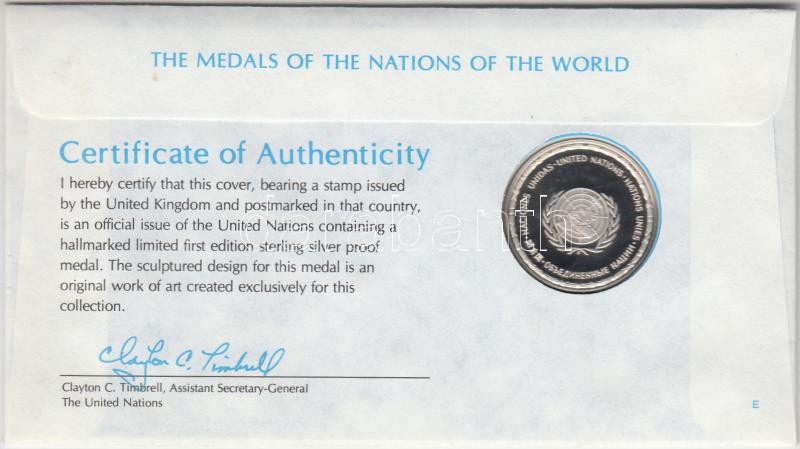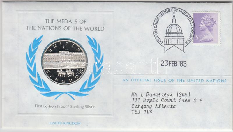 ENSZ 1983. "A Világ nemzeteinek emlékérmei - Egyesült Királyság" Ag emlékérem (15g/0.925/32mm) megcímzett érmés borítékon elsőnapi bélyegzős bélyeggel, hátoldali tanúsítvánnyal, ismertetőkkel T:PP