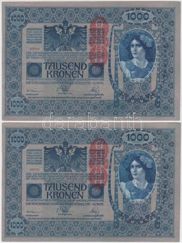 1902. 1000K "Deutschösterreich" (2x) sorszámkövetőek T:I,I- ... https://www.darabanth.com/de/207-Fernauktion/207.0/Numismatik/Ungarische-Banknoten~200009/1902-1000K-Deutschosterreich-2x-sorszamkovetoek-TI-I-apro-szamarful-3Cbr3EAdamo-K35B~II843045