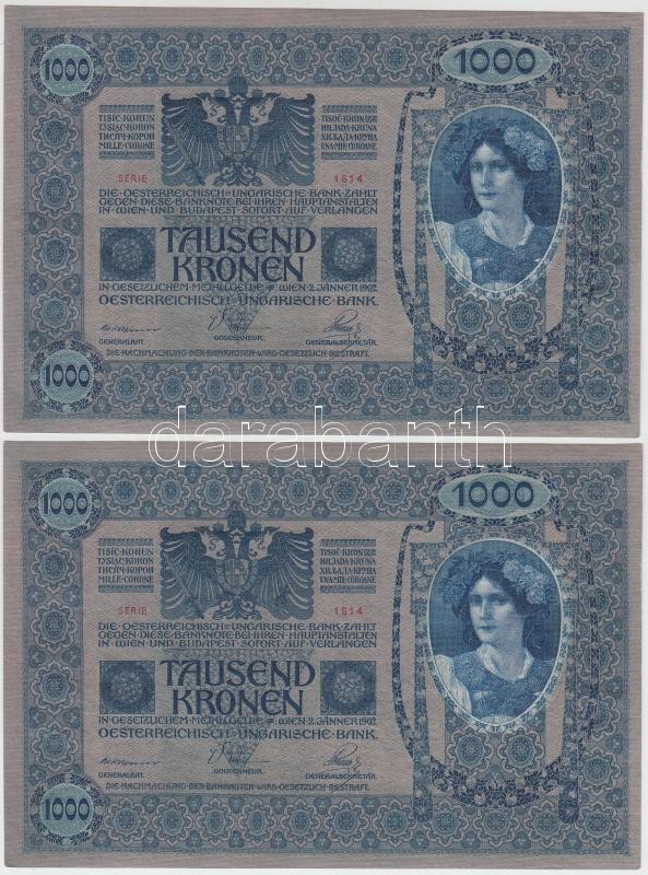Beschreibung: 1902. 1000K "Deutschösterreich" (2x) sorszámkövetőek T:I,I- (apró szamárfül)
