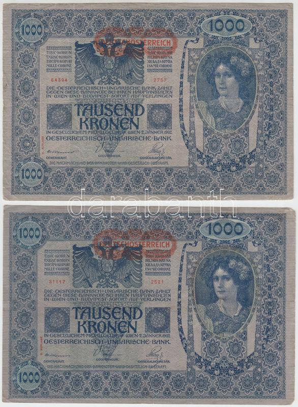 1902. 1000K "Deutschösterreich" felülbélyegzéssel, mindkét o... https://www.darabanth.com/de/207-Fernauktion/207.0/Numismatik/Ungarische-Banknoten~200009/1902-1000K-Deutschosterreich-felulbelyegzessel-mindket-oldal-nemet-2x-TIII-3Cbr3EAdamo-S~II843069