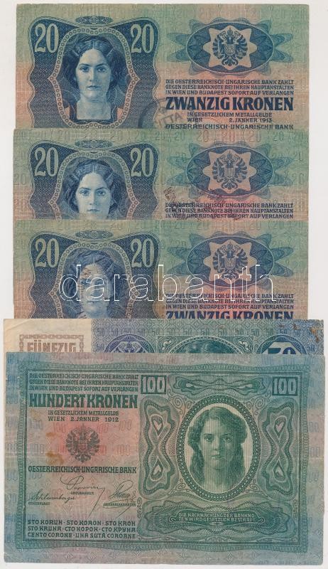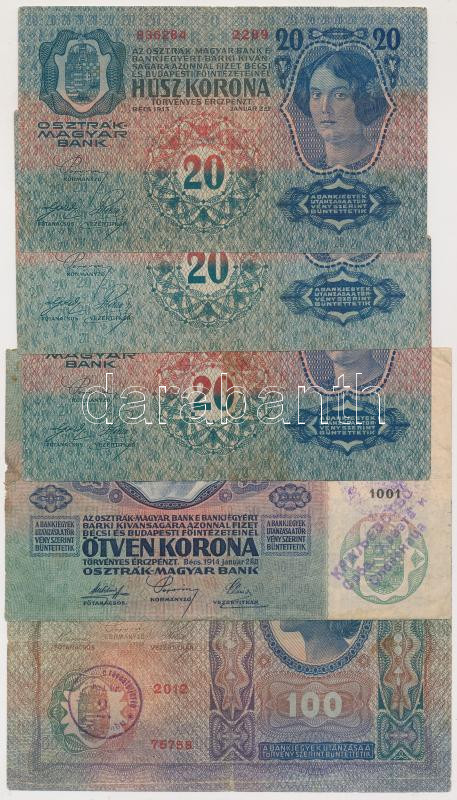 1912. 100K horvát felülbélyegzéssel + 1913. 20K (3x) "Citta Di Fiume" és szerb felülbélyegzéssel + 1914. 50K szerb felülbélyegzéssel T:III,III-