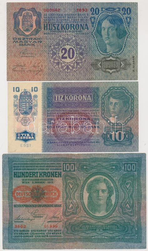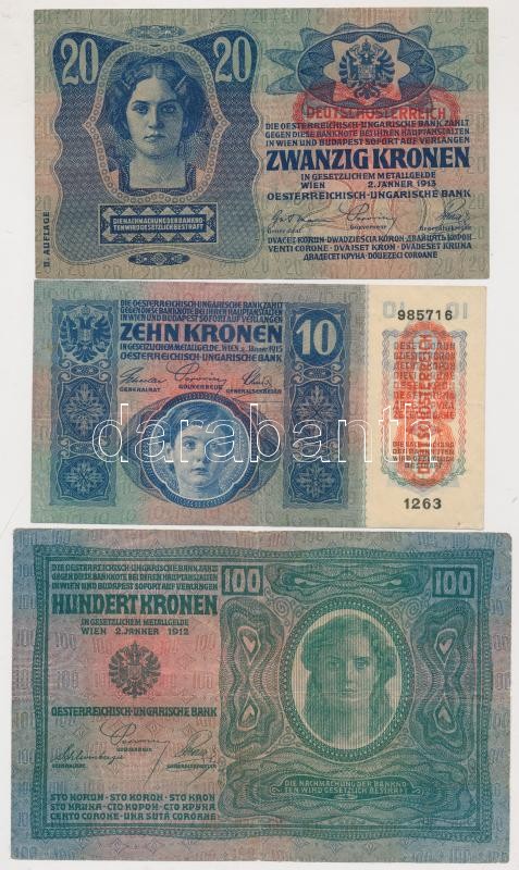 Beschreibung: 1912. 100K mindkét oldal német + 1913. 20K II. kiadás + 1915. 10K mindegyeik piros "Deutschösterreich" felülbélyegzéssel T:III (egyiken kis lyukak)