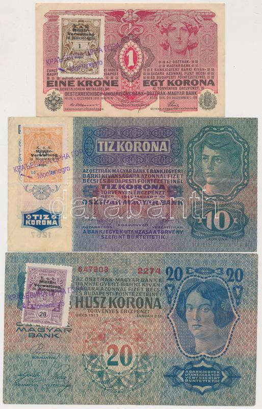 Beschreibung: 1913. 20K + 1915. 10K "Deutschösterreich" felülbélyegzéssel + 1916. 1K mindhárom 1/10/20 Para K.u.k. Montenegrói bélyeggel és pecsételéssel T:II-,III