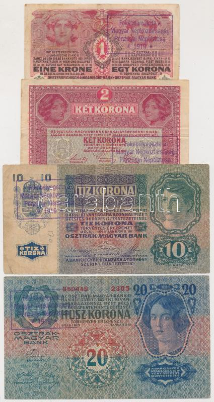 Beschreibung: 1913. 20K + 1915. 10K + 1916. 1K + 1917. 2K mindegyik "Felülbélyegezte a Magyar Népköztársaság Pénzügyi Népbiztosa 1919" felülbélyegzéssel T:III,III-