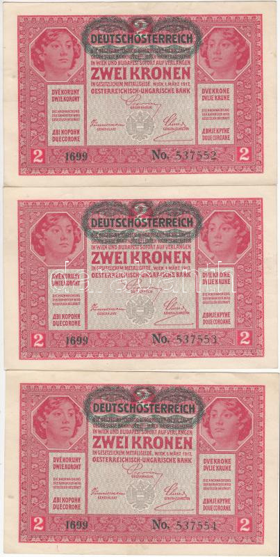 Beschreibung: 1917. 2K zöld "Deutschösterreich" felülbélyegzéssel (3x) sorszámkövetők T:II-/III (szép papír)