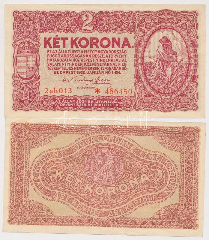 1920. 1K + 2K "2aa" + 2K "2ab" (2x) T:I-,III https://www.darabanth.com/de/207-Fernauktion/207.0/Numismatik/Ungarische-Banknoten~200009/1920-1K-plus-2K-2aa-plus-2K-2ab-2x-TI-III~II838674